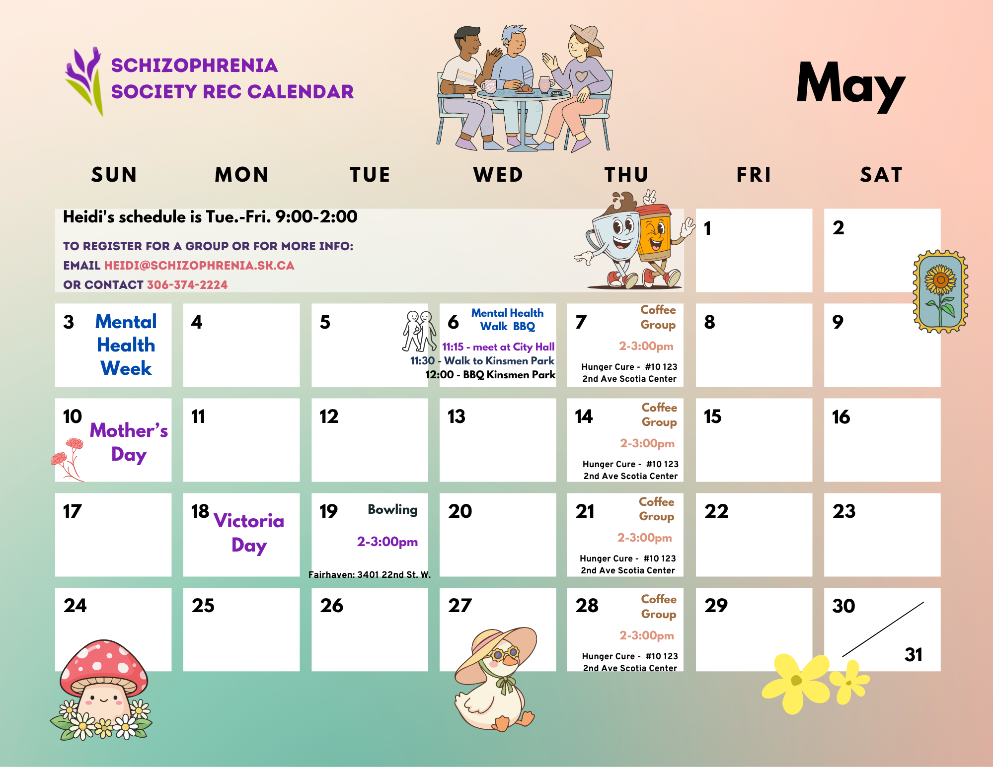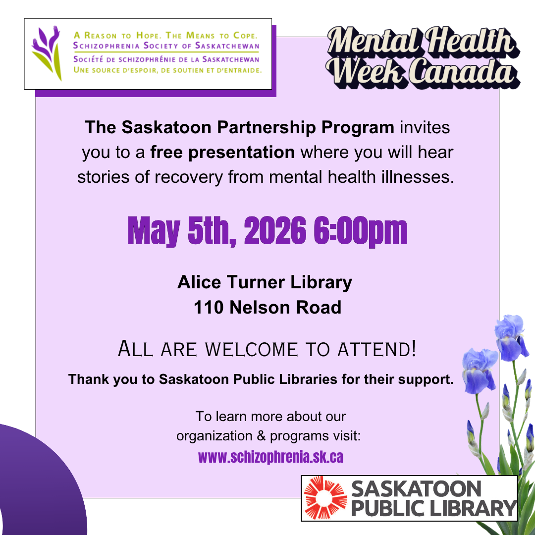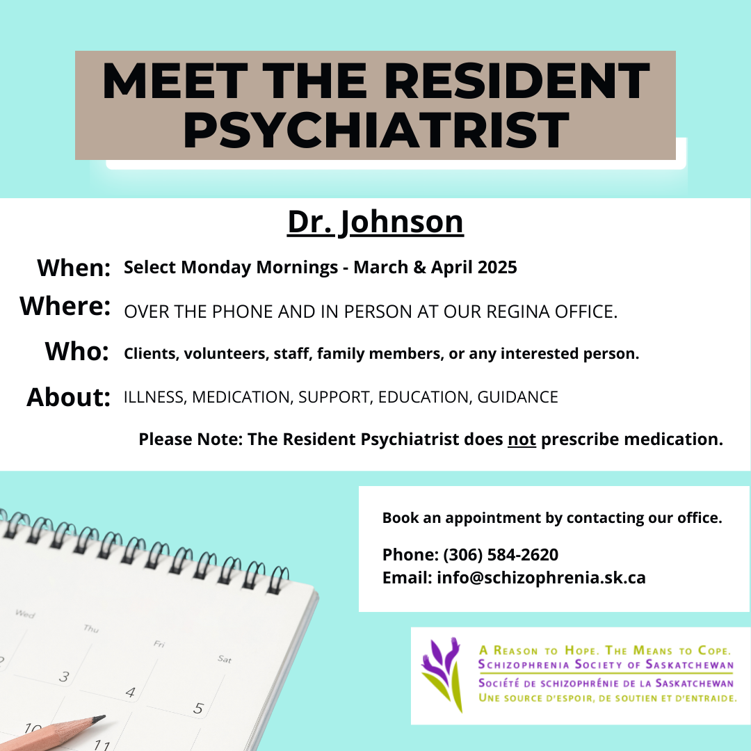 If you or someone you know is diagnosed with schizophrenia or psychosis, the Schizophrenia Society of Saskatchewan has a variety of different support and program options for you throughout the province.