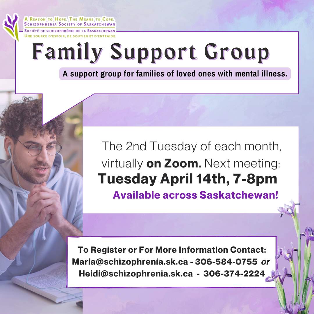 Our Family Support Group is available provincewide for individuals who have a family member that experiences mental illness. We meet digitally on Zoom; this allows our group to be accessible across all of Saskatchewan! We meet on the second Tuesday of every month, from 7:00-8:00pm. Our next group will be held on April 14th at 7:00pm