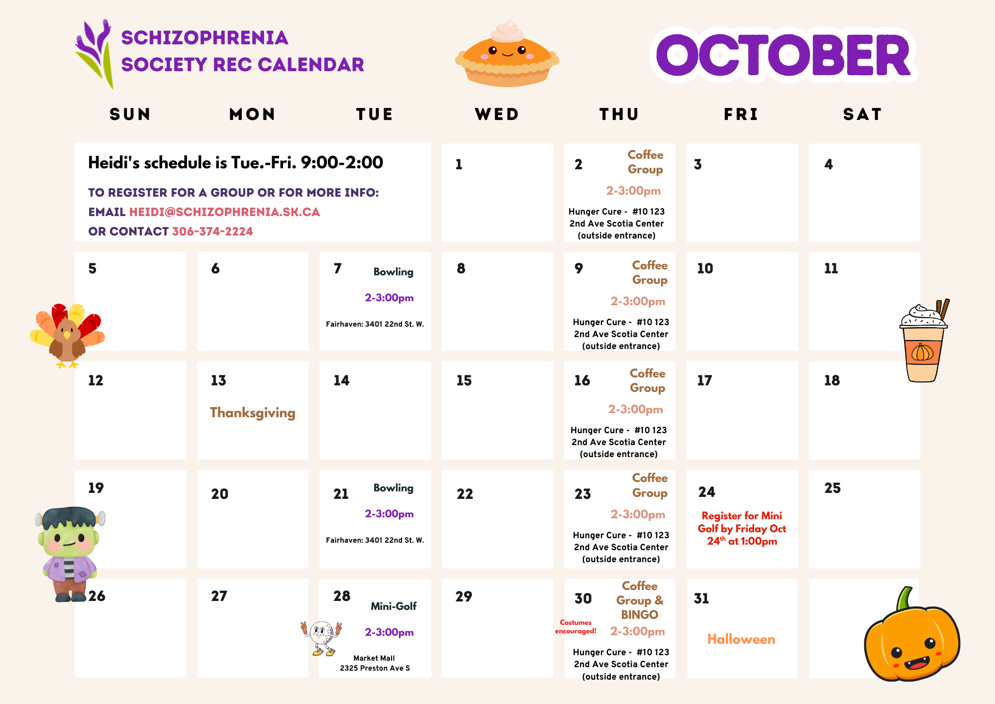 To register with the group or for more information please contact Heidi at (306) 374-2224 or email heidi@schizophrenia.sk.ca.